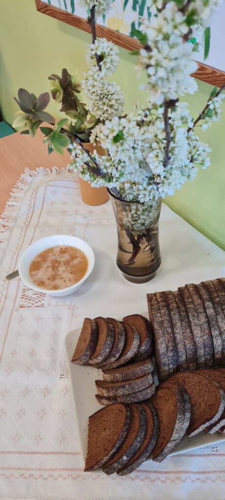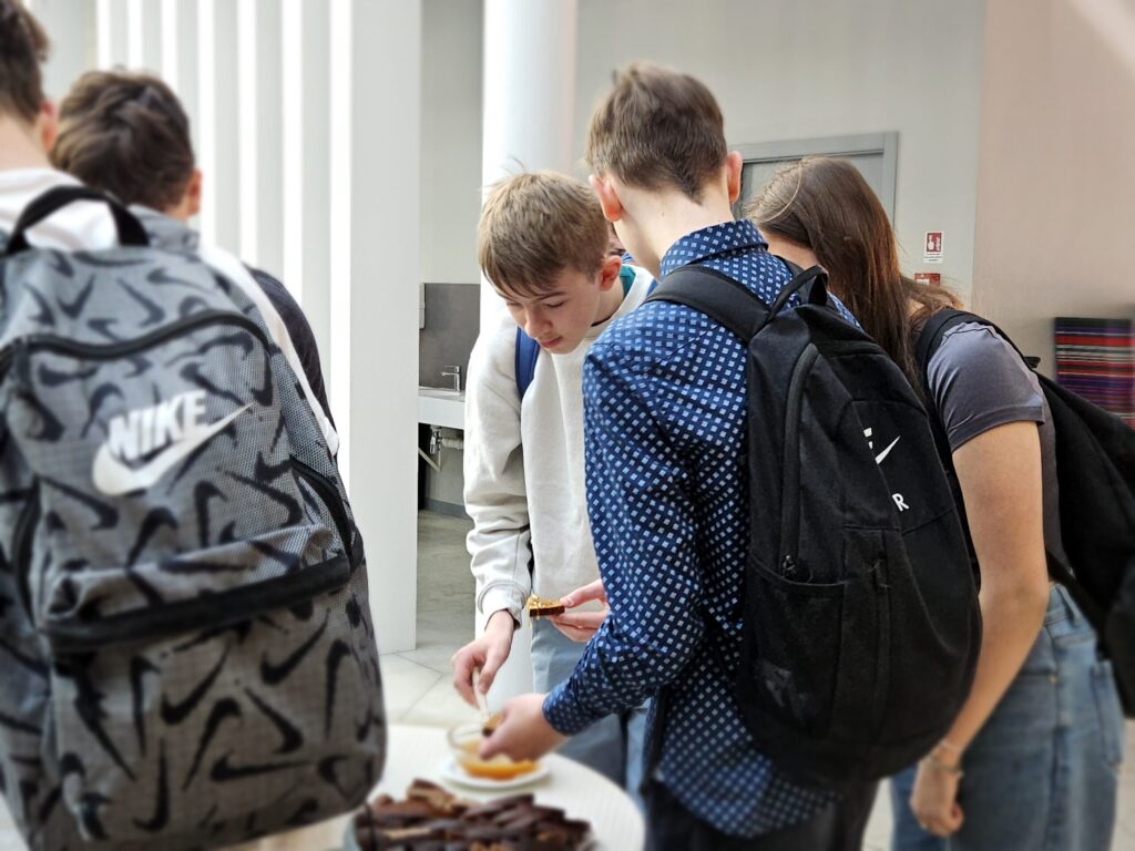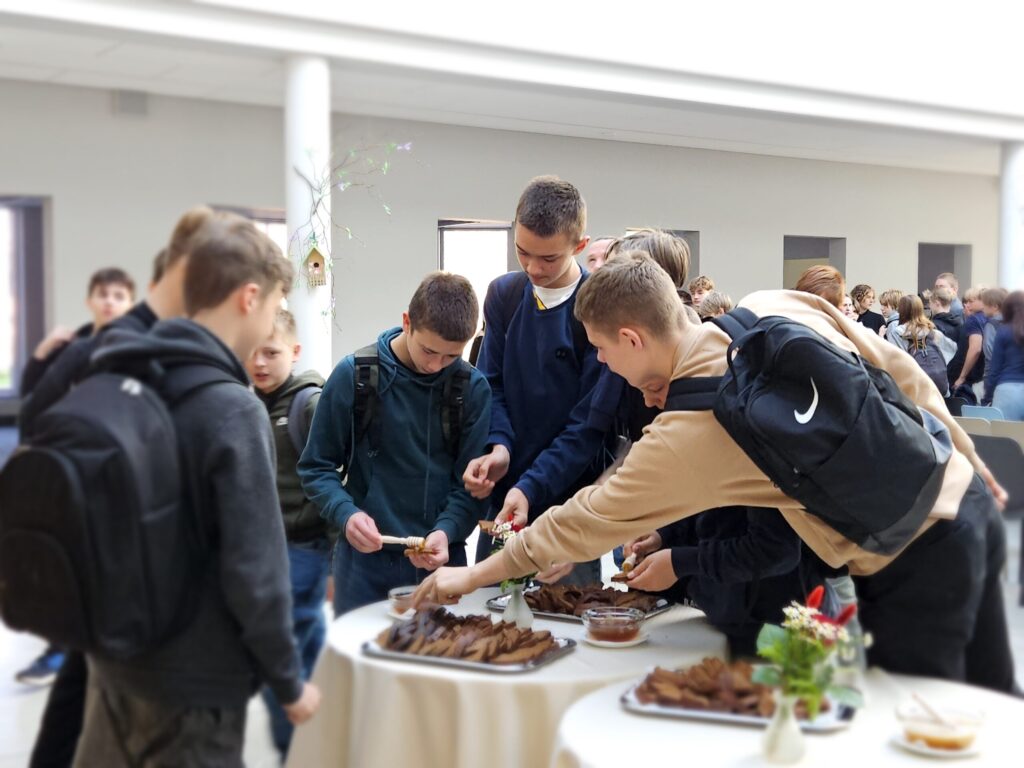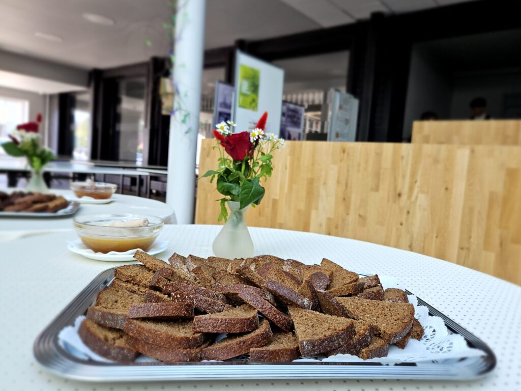 Skolēni pie galdi klātiem galdiem mielojās ar medu un maizi, kas ir nozīmīgs tautas identitātes simbols, latviešu materiālās un garīgās kultūras daļa.