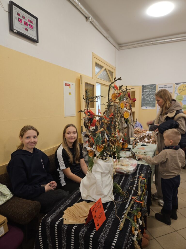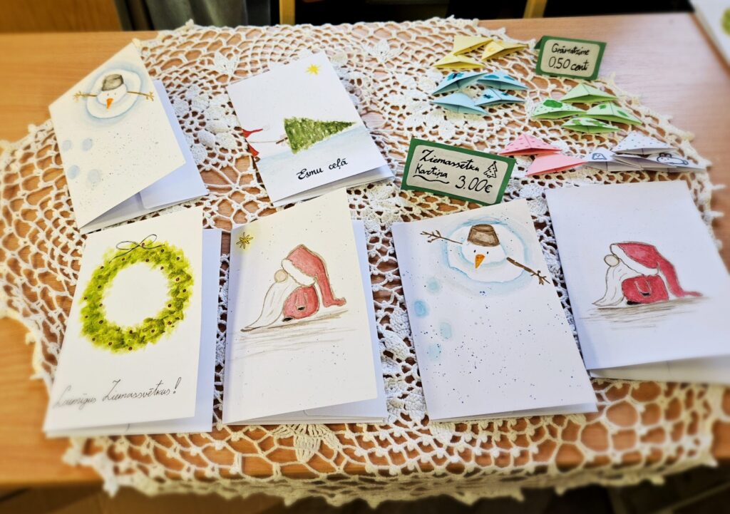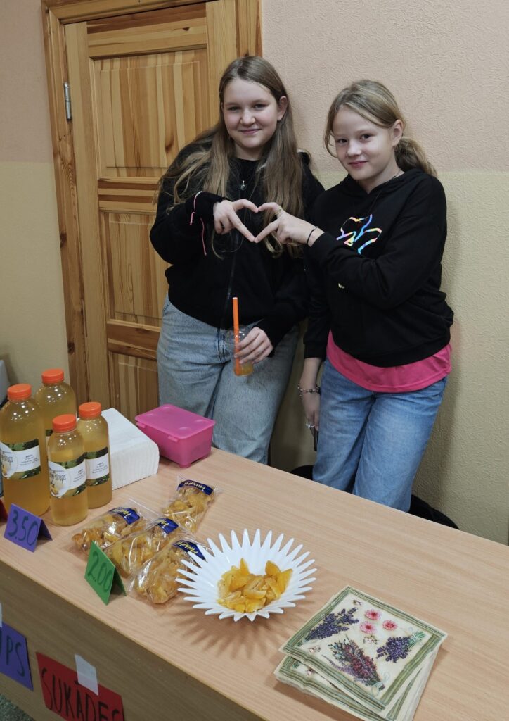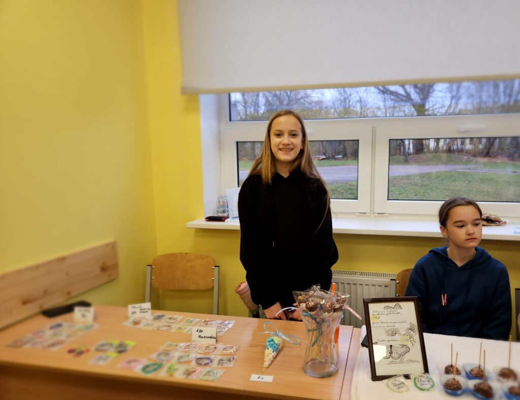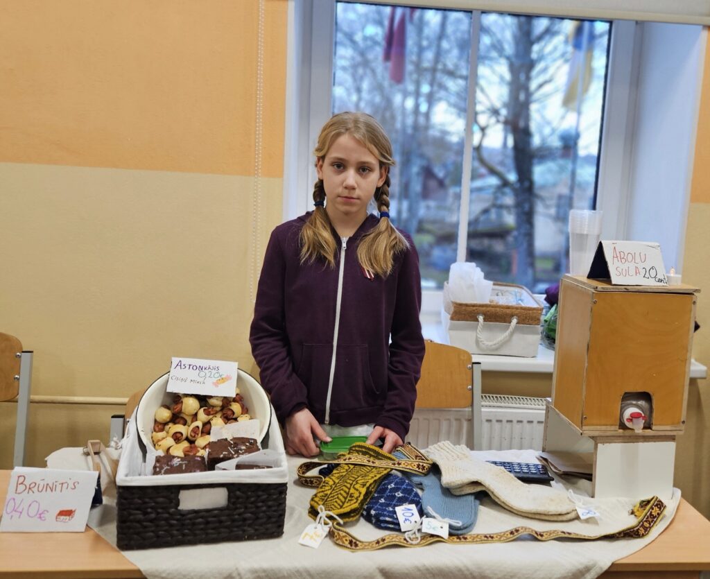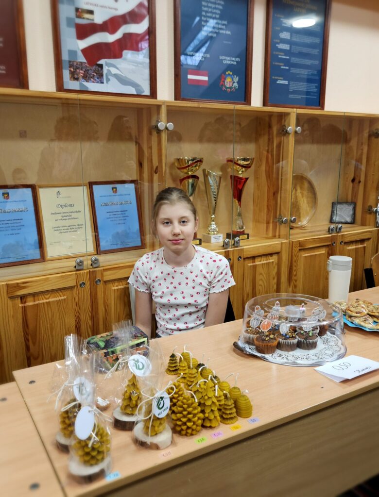 Emīlija pārdeva Ziemassvētku un Jaunā gada apsveikumu kartiņas. Katrs darbs – no ieceres līdz tās īstenošanai aizņēmis vairāk nekā stundu. Vizuālās makslas talantu Emīlija izkopusi Smiltenes mākslas skolā. Eva uz tirdziņu atnesusi pašas gatavotos telpu dekorus. “Visvairāk laika aizņēma izejmateriālu sagatavošana,” atzīst mazā uzņēmēja, lepna par to, ka visi dekori ir no dabas materiāliem. Dizaina idejas Eva atradusi internetā.