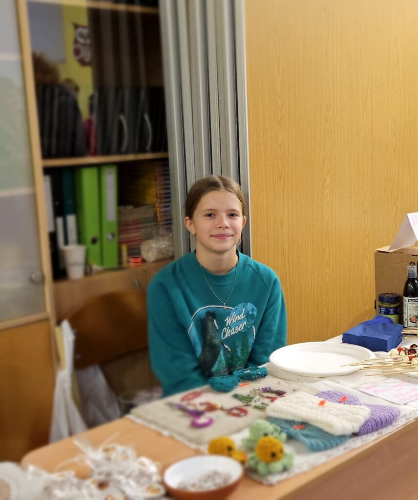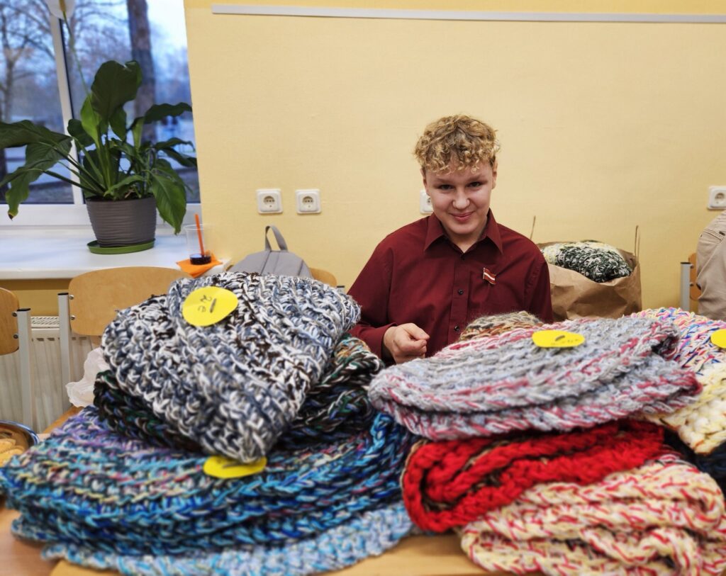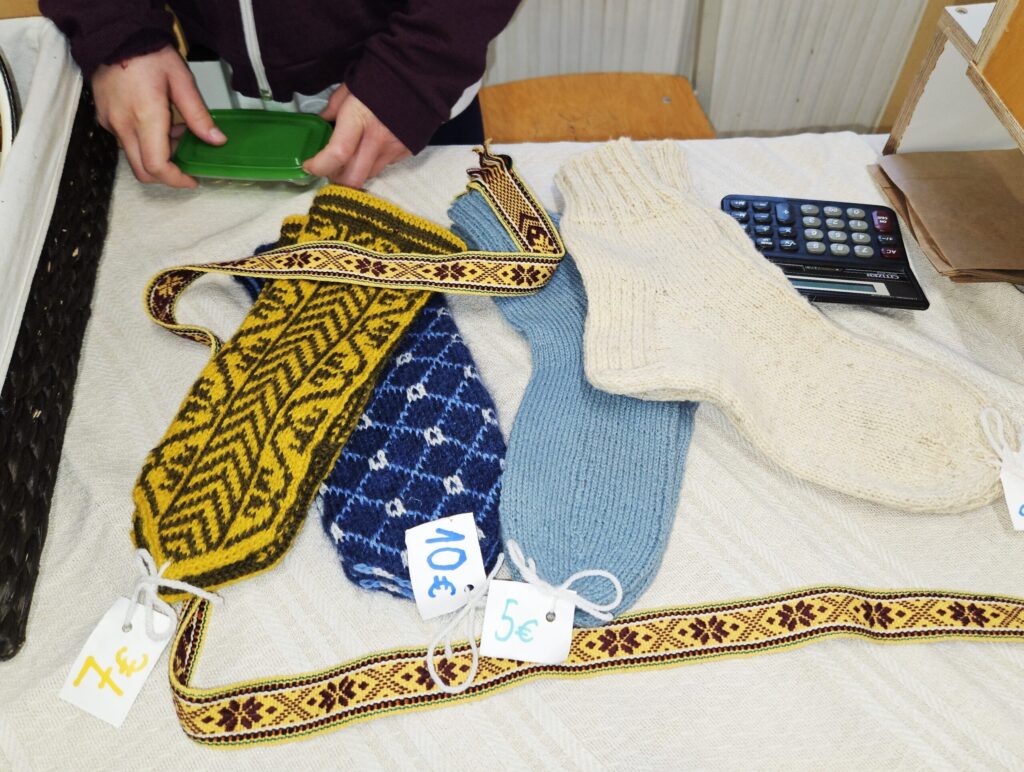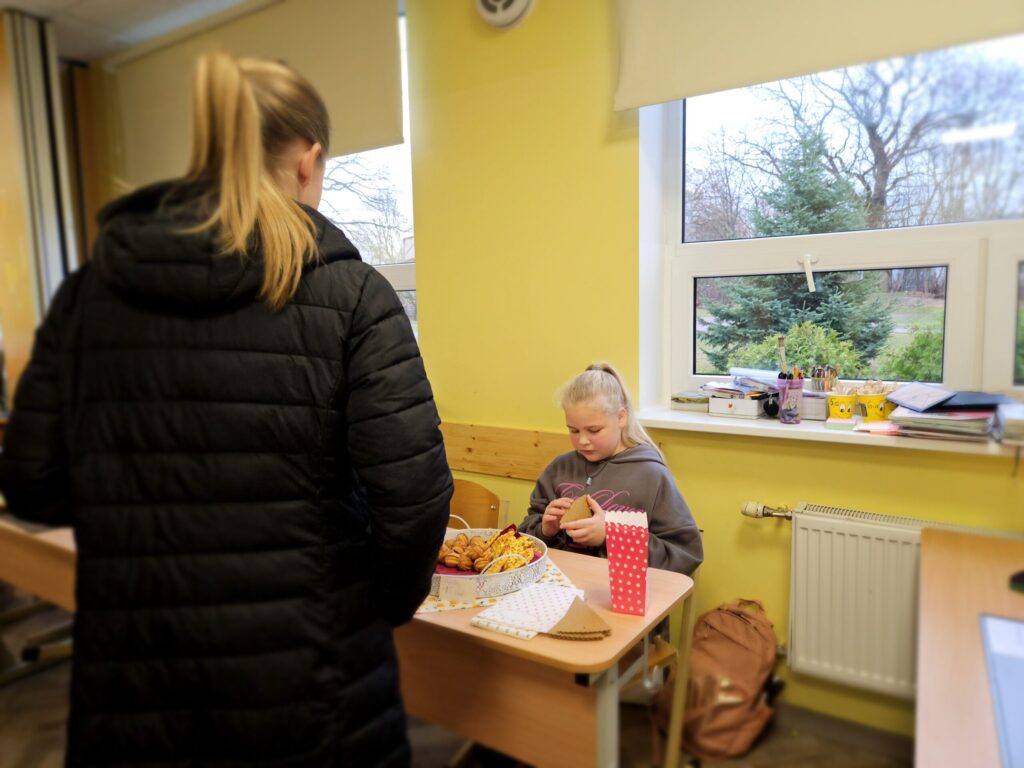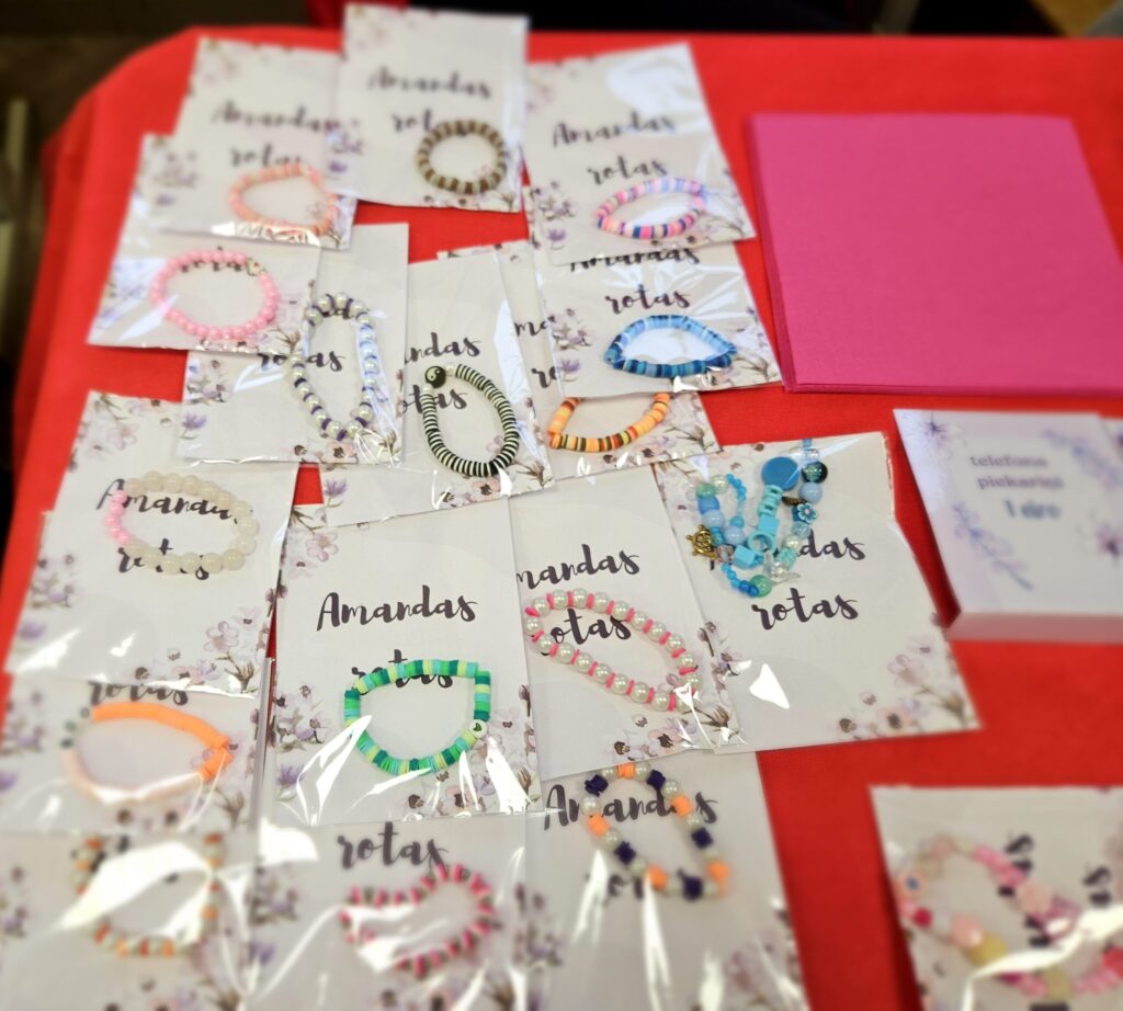 Emīlija pārdeva Ziemassvētku un Jaunā gada apsveikumu kartiņas. Katrs darbs – no ieceres līdz tās īstenošanai aizņēmis vairāk nekā stundu. Vizuālās makslas talantu Emīlija izkopusi Smiltenes mākslas skolā. Eva uz tirdziņu atnesusi pašas gatavotos telpu dekorus. “Visvairāk laika aizņēma izejmateriālu sagatavošana,” atzīst mazā uzņēmēja, lepna par to, ka visi dekori ir no dabas materiāliem. Dizaina idejas Eva atradusi internetā.