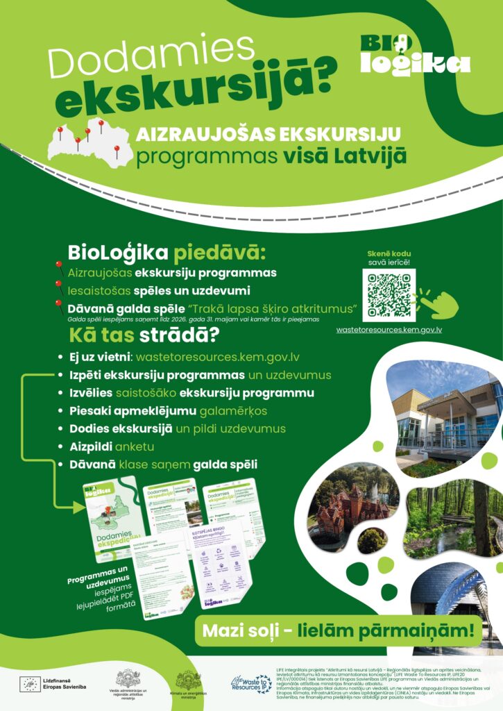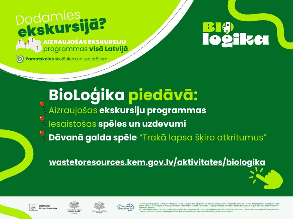 Vebinārs par praktiskiem soļiem, kā pieteikties ekskursijām, notiks šā gada 7. oktobrī plkt.16.00 Zoom platformā (reģistrācija vebināram šeit). Plašāka informācija par pieteikšanos, ekskursiju programmām un mācību materiāliem pieejama mājaslapā wastetoresources.kem.gov.lv sadaļā “BioLoģika”.