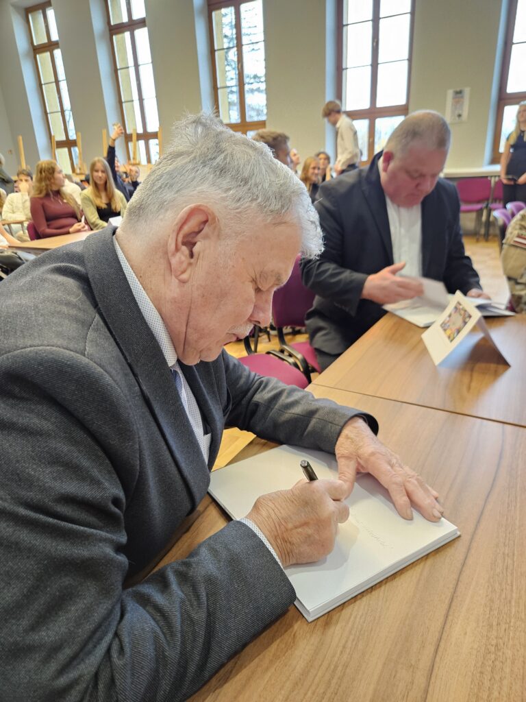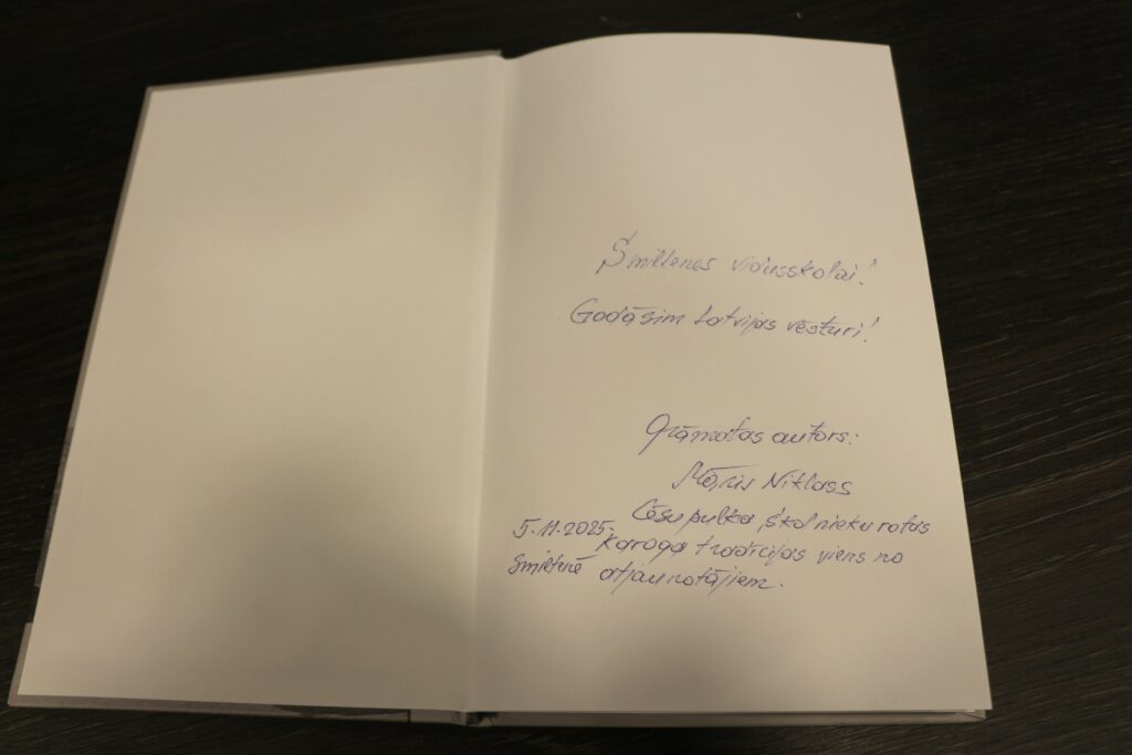Māris Niklass uzdāvināja skolai savu un Gunas Rukšānes jaunāko grāmatu “Cēsu uzvaras pieminekļi”.