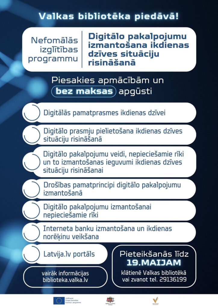 Valkas novada Centrālā bibliotēka piedāvā apgūt neformālās izglītības programmu “Digitālo pakalpojumu izmantošana ikdienas dzīves situāciju risināšanā” cilvēkiem bez vai ar nelielām priekšzināšanām datoru lietošanas un e-prasmju jomā.