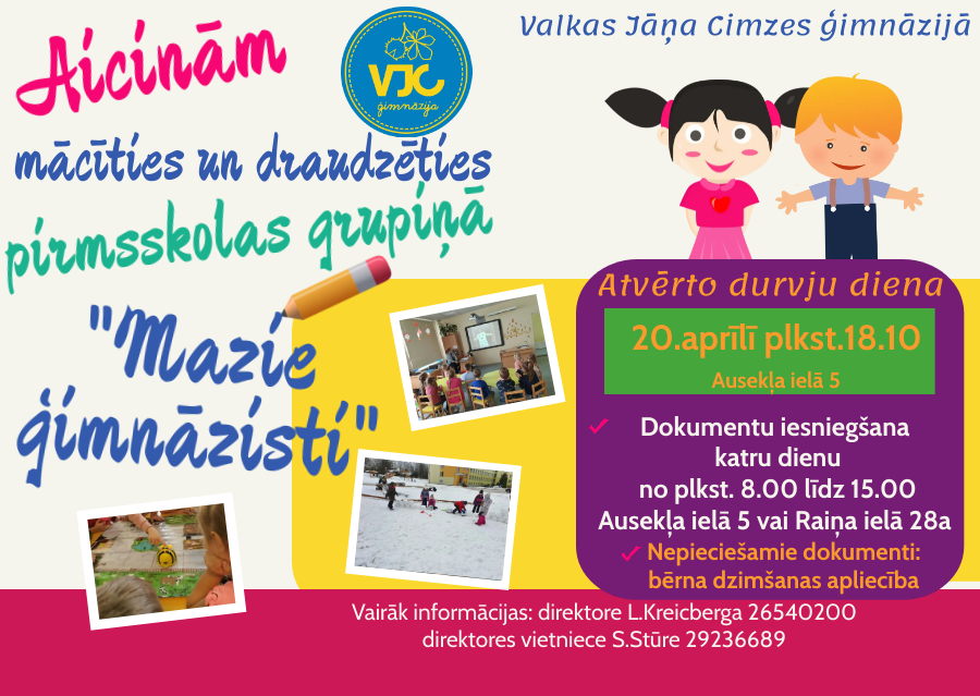 Sākusies dokumentu pieņemšana Valkas Jāņa Cimzes ģimnāzijas pirmsskolas grupiņai “Mazie ģimnāzisti” un 1.klasei.