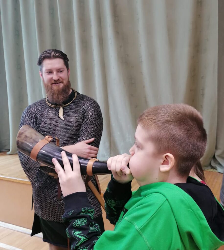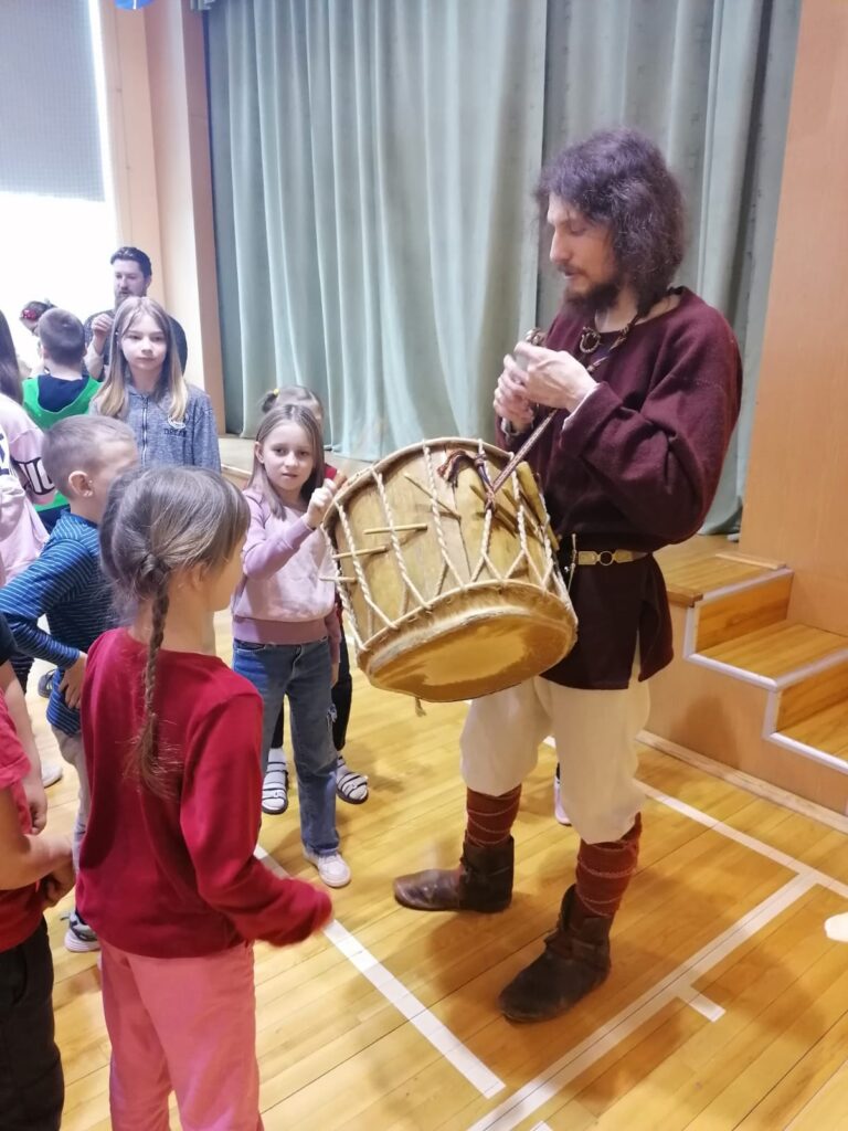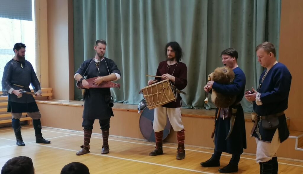 Mums bija iespēja klausīties latviešu tautasdziesmas, iepazīt grupas dalībnieku tērpu sastāvdaļas, kā arī iespēju pašiem uzspēlēt senos instrumentus!