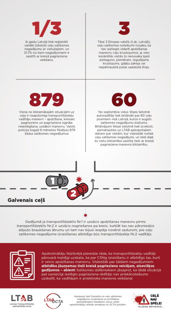 Viena no bīstamākajām situācijām ceļu satiksmē ir neapdomīgi transportlīdzekļu vadītāju manevri – apdzīšana, kreisais pagrieziens un pagrieziena signāla neieslēgšana, uzsākot manevru. Valsts policija šogad 9 mēnešos fiksējusi 879 šādus satiksmes negadījumus. Lai aktualizētu problēmu, Latvijas Transportlīdzekļu apdrošinātāju birojs (turpmāk – LTAB) oktobrī īstenoja informatīvu kampaņu “Ceļš nav spēle! Kļūdas nepiedod…”.