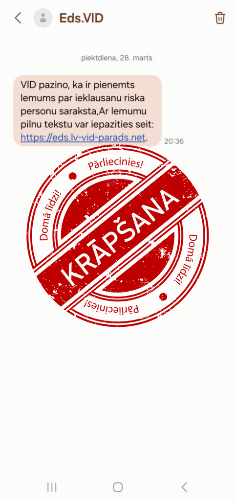 Valsts policijā Liepājā pēdējās dienās saņemti trīs iesniegumi no iedzīvotājiem, kuri kļuvuši par krāpnieku upuriem. 29. martā kāda sieviete saņēmusi īsziņu savā mobilajā tālrunī it kā no Valsts ieņēmumu dienesta par to, ka it kā ir izveidojies nodokļu parāds. Sieviete uzspieda uz hipersaiti, kas bija īsziņā, ievadīja bankas datus un no viņas bankas konta tika pārskaitīti vairāk nekā 1000 eiro uz citu bankas kontu.