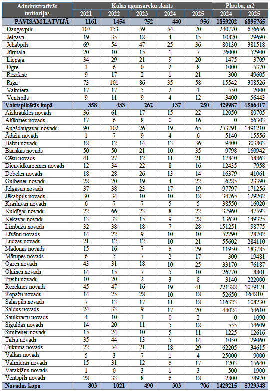 Aizvadītajā gadā visvairāk kūlas ugunsgrēku dzēsts Daugavpilī (70), Augšdaugavas novadā (65) un Rīgā (58), savukārt vismazāk – Saulkrastu novadā (2), Valmierā (3) un Varakļānu novadā (3).