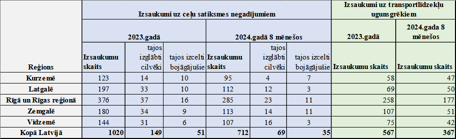 Šī gada astoņos mēnešos ugunsdzēsēji glābēji devās uz 712 ceļu satiksmes negadījumu seku likvidēšanas darbiem, kuros izglāba 69 cilvēkus un atbrīvoja 35 bojāgājušos, kā arī saņemti 367 izsaukumi, kuros dega transportlīdzekļi. Aizvadītajā gadā 1020 ceļu satiksmes negadījumu likvidēšanas darbos izglābti 149 cilvēki un atbrīvots 51 bojāgājušais, bet transportlīdzekļi dega 567 reizes.