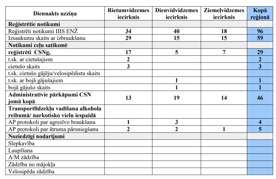 Laika posmā no 23.11.2023. – 24.11.2023. saņemta informācija par 96 gadījumiem, kad iedzīvotāji vērsušies pēc palīdzības policijā vai konstatēts, ka noticis noziedzīgs nodarījums. Reģistrēti 29 ceļu satiksmes negadījumi, kuros cietušas trīs personas un viena persona gājusi bojā. Satiksmes jomā pieņemti 46 administratīvā pārkāpuma lēmumi, tajā skaitā 5 par ātruma pārsniegšanu, četri par agresīvu braukšanu un neviens par transportlīdzekļa vadīšanu alkohola reibumā.