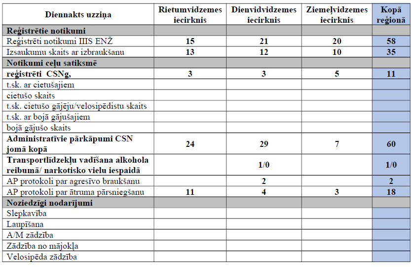 Laika posmā no 29.11.2023. ­– 30.11.2023. saņemta informācija par 58 gadījumiem, kad iedzīvotāji vērsušies pēc palīdzības policijā vai konstatēts, ka noticis noziedzīgs nodarījums. Reģistrēti 11 ceļu satiksmes negadījumi, kuros nav cietušas personas. Satiksmes jomā pieņemti 60 administratīvā pārkāpuma lēmumi, tajā skaitā 18 par ātruma pārsniegšanu, divi par agresīvu braukšanu un viens par transportlīdzekļa vadīšanu alkohola reibumā.
