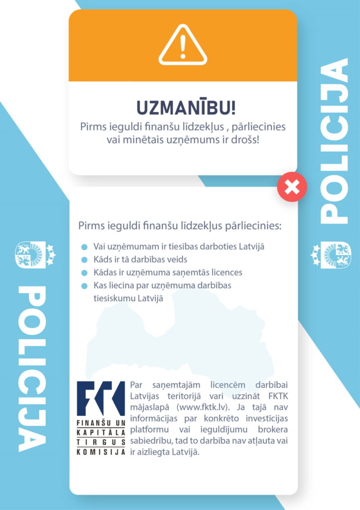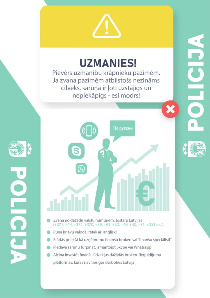 Policija atkārtoti aicina iedzīvotājus būt piesardzīgiem, saņemot telefona zvanus no nezināmām personām, kuras runā tikai un vienīgi krievu valodā, sauc sevi par dažādu uzņēmumu finanšu brokeriem vai arī cita veida “finanšu speciālistiem”. Tāpat nevajadzētu būt pārlieku uzticīgiem, komunicējot ar nepazīstamiem cilvēkiem vai iepazīstoties sociālos tīklos ar virtuālajiem lietotājiem. Nedrīkst nevienam izpaust savus personas vai elektronisko maksāšanas līdzekļu datus, tā jūs sevi varat pasargāt no kļūšanas par krāpniecības upuriem.