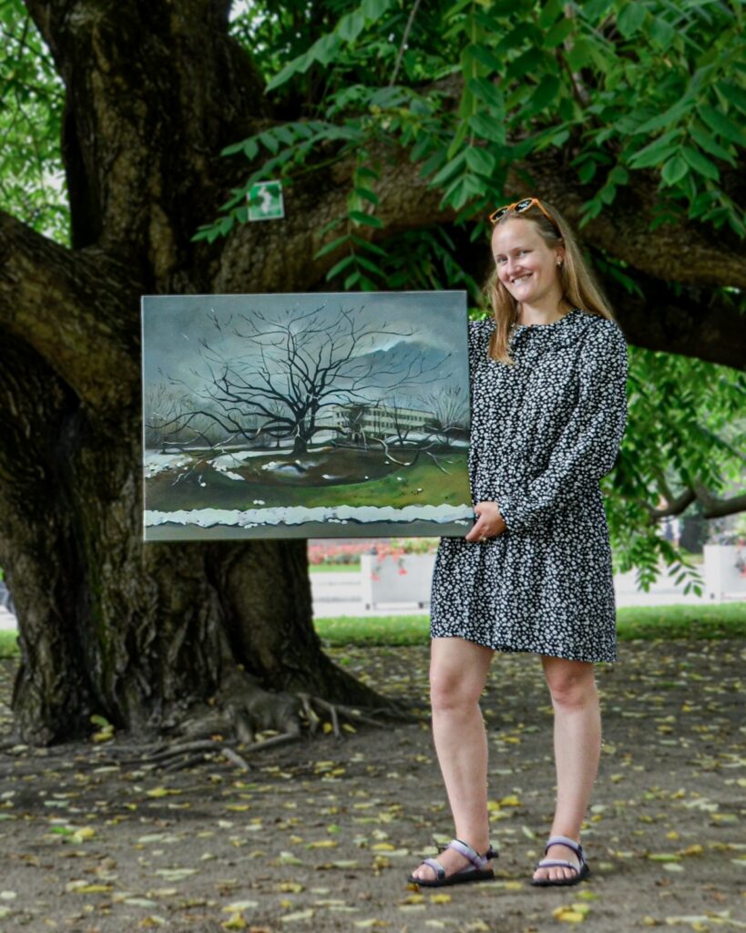 Šīs vasaras kādā rītā ar sauli uzausis arī nemiers, ka vēl reizi ir jāuzglezno Dzenīšu dižvītols. “Tieši šī apziņa, ka esmu piedzīvojusi koka garajā mūžā tik izteiktas izmaiņas, nelika mani mierā. Un tā tapa viena no pēdējām, tas gan pagaidām, dižkoka gleznām šajā seriālā,” viņa saka.