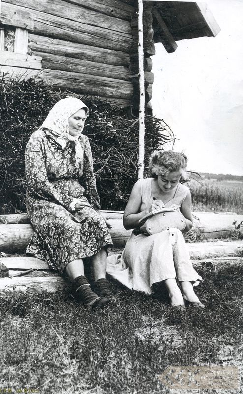 Foto: Studente V. Kraukle pieraksta teicējas Franciskas Batores dziesmas un mīklas. Aglonas pagasta Botori, 1959.