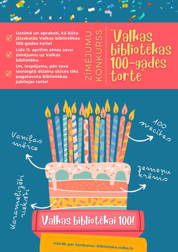 Valkas bibliotēka, pošoties 100-gades svinībām, aicina Bērnu literatūras nodaļā reģistrētos bērnus un jauniešus piedalīties zīmējumu konkursā “Bibliotēkas 100-gades torte”.