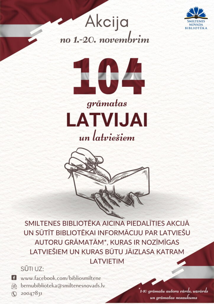 Latvieši ir ne tikai lieli sēņotāji, dejotāji un dziedātāji, bet arī grāmatu lasītāji. Sagaidot Latvijas Republikas proklamēšanas 104.gadadienu, Smiltenes bibliotēka vēlas noskaidrot, kuras latviešu autoru grāmatas mums ir nozīmīgas, tāpēc aicina ikvienu piedalīties akcijā “104 grāmatas Latvijai un latviešiem”.
