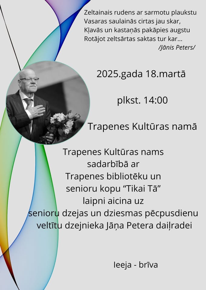 Senioru dzejas un dziesmu pēcpusdienas pasākumu, kas veltīts dzejnieka Jāņa Petera daiļradei, organizē Trapenes kultūras nams sadarbībā ar Trapenes bibliotēku un senioru kopu “Tikai Tā”. Laipni aicināts ikviens. Ieeja bez maksas.