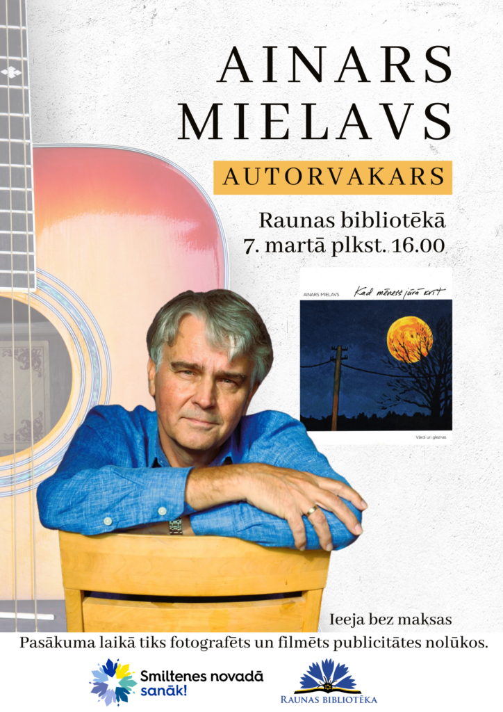 Ainars Mielavs ir dziedātājs un dziesmu rakstnieks kopš 1986. gada. Uzstājies ar grupām JAUNS MĒNESS, MIELAVS UN PĀRCĒLĀJI un arī kā solo mākslinieks. Dziedātājs savulaik ir beidzis Latvijas Mākslas akadēmiju un pēdējos gados pēc 30 gadu pārtraukuma atsācis gleznot. Dziedātājs pastāstīs par savu dziesmu vārdu un gleznu grāmatu “Kad mēness jūrā krīt” un uzdziedās kopā ar citu ievērojamu latviešu muzikantu Aigaru Voitišķi. Laipni gaidīti visi interesenti!