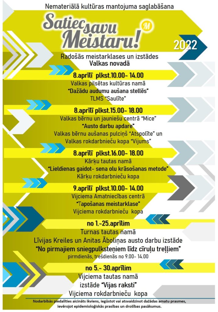 Laikā no 1 aprīļa līdz 30. aprīlim satikt savu meistaru un piedalīties radošajās meistarklasēs būs iespējams Valkas bērnu un jauniešu centrā ‘Mice”, Vijciema, Turnas, Kārķu tautas namos un Valkas pilsētas kultūras namā, kā arī Vijciema Amatniecības centrā.