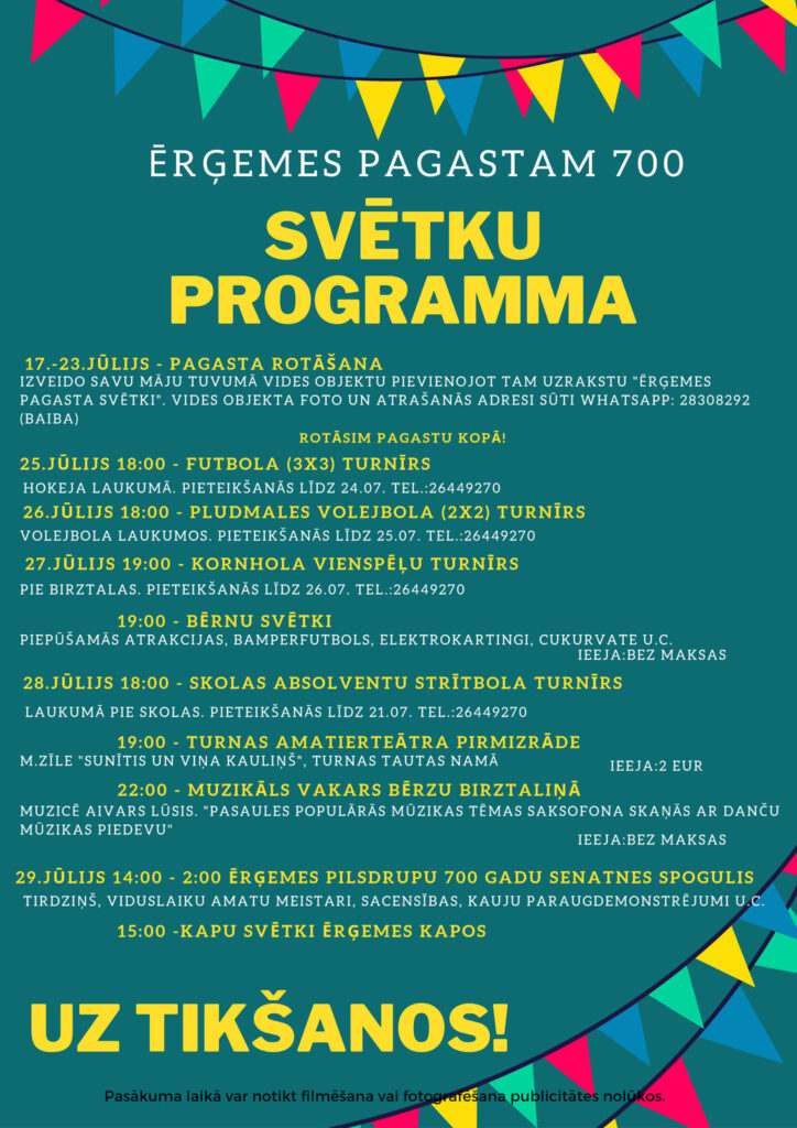 Tradicionāli jūlija mēnesis ir Ērģemes pagasta svētku mēnesis. Šogad šie svētki skaitļa 700 zīmē, atzīmējot arī Ērģemes pilsdrupu 700 gadi. No 17.jūlijā līdz 23.jūlijam notiks pagasta rotāšanas aktivitātes, kur tiek aicināti iesaistīties vietējās kopienas cilvēki, veidojot vides objektus māju tuvumā.