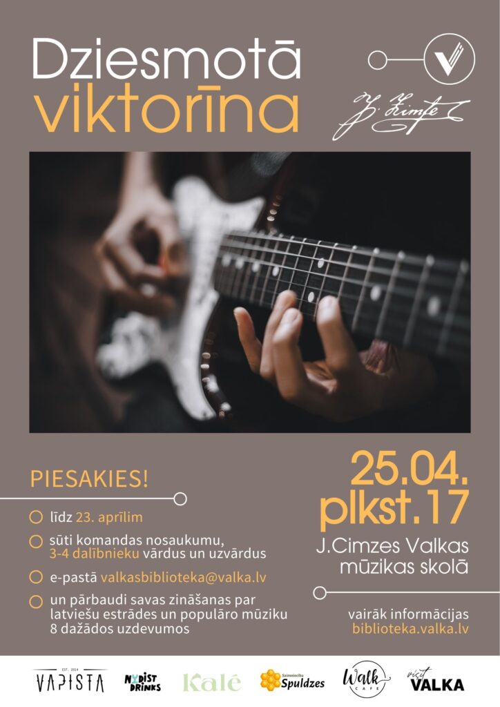 Atzīmējot Bibliotēku nedēļu, 25. aprīlī plkst.17 J. Cimzes Valkas mūzikas skolā notiks muzikāli izzinošs un izklaidējošs pasākums “Dziesmotā viktorīna”. Tajā apvienotas dažādas muzikālo un klasisko viktorīnu šovu aktivitātes, kas ļaus pārbaudīt zināšanas latviešu estrādes un populārajā mūzikā.