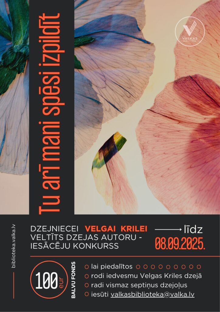 Valkas novada dzejas konkurss “Tu arī mani spēsi izpildīt” veltīts spilgtai novada dzejniecei Velgai Krilei. Tā mērķis ir, popularizējot novadnieces vārdu un radošo devumu, atklāt jaunos dzejas talantus un veicināt literāro dotību attīstīšanu.