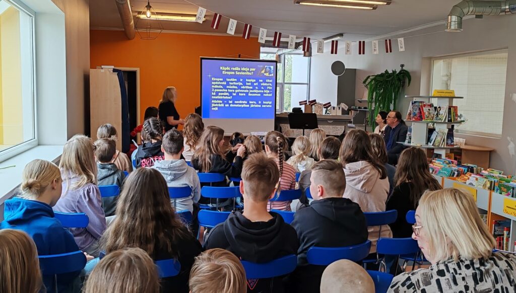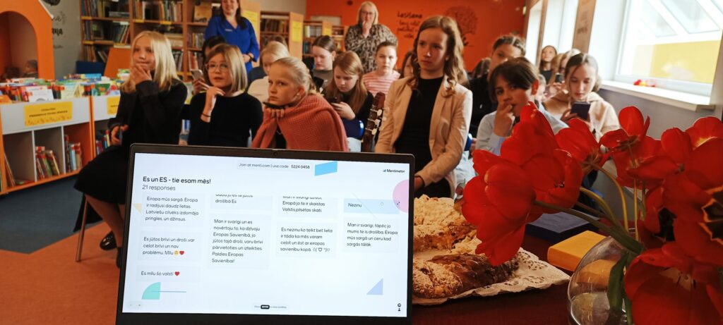 Ar Smiltenes bibliotēkas Eiropas Savienības (turpmāk ES) informācijas punkta koordinatores Aldas Liukes uzrunu tika atklātas Eiropas dienas svinības. Svētki tika svinēti atraktīvi, visiem radoši un aktīvi līdzdarbojoties. Interaktīvā veidā skolēni izteica savu viedokli, domas par to, kāpēc viņiem svarīgi dzīvot ES. Skolēnu izveidotais vārdu mākonis “Es un ES – tie esam mēs” skaidri parādīja, kas ir pats svarīgākais – drošības sajūta, miers, brīvība, ceļošanas iespējas.