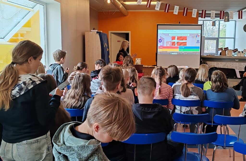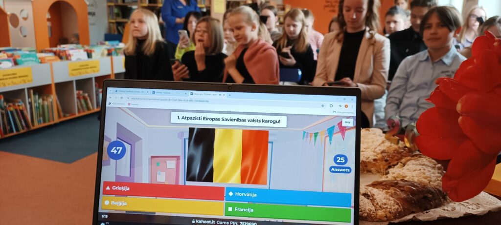 Ekspress viktorīna “Atpazīsti Eiropas Savienības valstis karodziņos” tika izspēlēta vietnē Kahoot. Skolēniem bija jāatpazīst 15 Eiropas Savienības valstu karogi. Patīkami pārsteidza skolēnu lieliskās zināšanas, bet trīs pareizāko un ātrāko atbilžu autori saņēma diplomus un balvas – Eliss Dūmiņš, Emīlija Agape Felce un Terēze Šaumberga.
