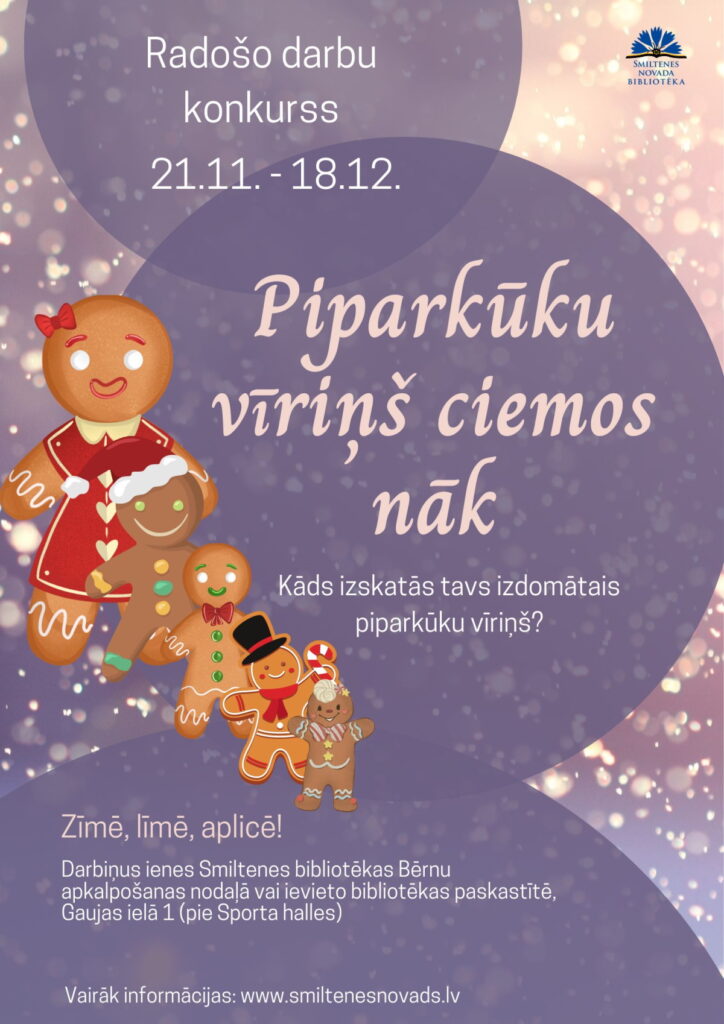 Kāds gan būtu Ziemassvētku laiks bez piparkūkām? Neiedomājams! Piparkūkas ir tradicionālie Ziemassvētku cepumi Latvijā, Igaunijā, Somijā un Skandināvijā. Smiltenes bibliotēkas Bērnu apkalpošanas nodaļa aicina bērnus piedalīties radošo darbu konkursā “Piparkūku vīriņš ciemos nāk!” – izdomāt un izveidot savu piparkūku vīriņu.