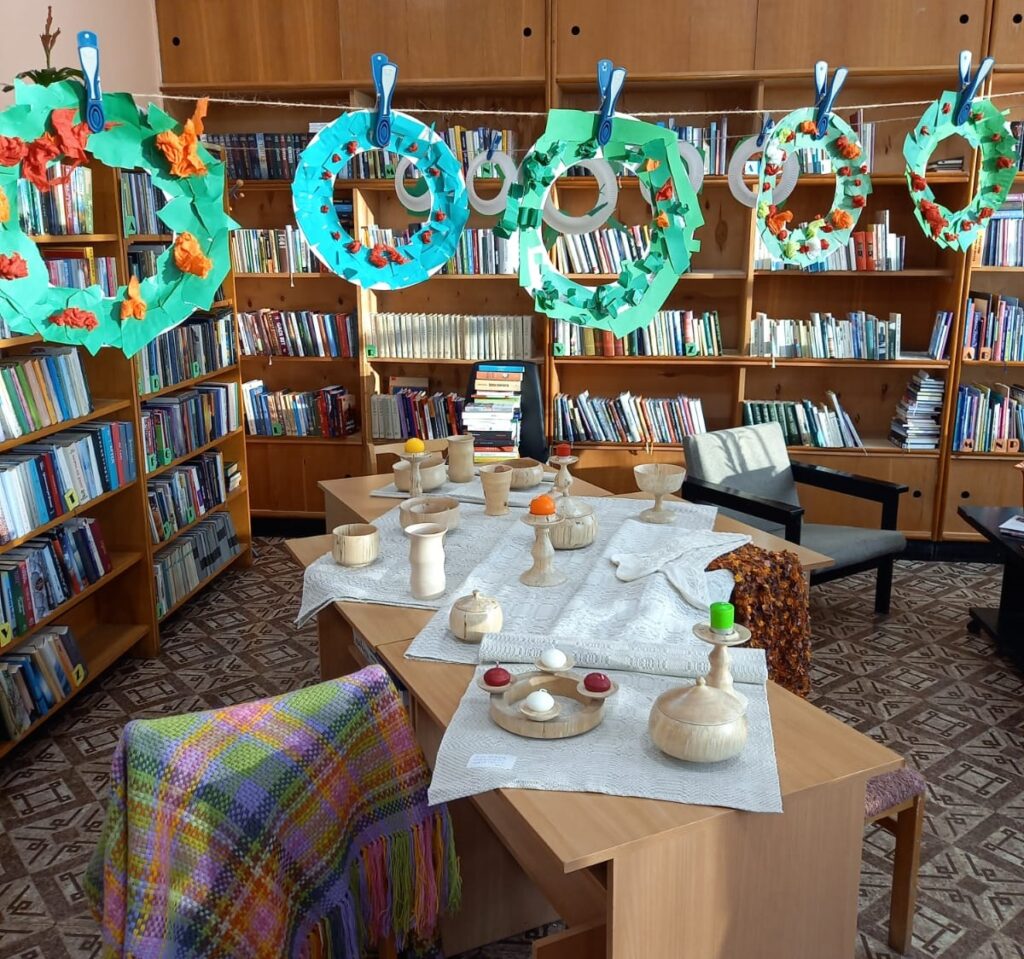 Grundzāles bibliotēka uz laiku kļuvusi par mājvietu mazo grundzāliešu adventes vainagiem un Zubovu ģimenes rokdarbiem.