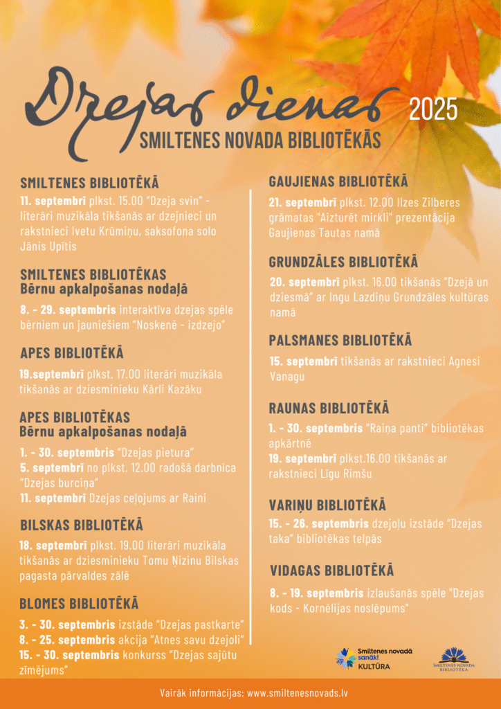 Smiltenes novada bibliotēkās šie svētki ienāk ar daudzveidīgām un radošām aktivitātēm: tikšanās ar dzejniekiem un rakstniekiem, muzikālas performances, interaktīvas spēļu nodarbības bērniem, literāri-muzikālas vakara stundas, izstādes un pat “dzejas takas”, kas aicina dzeju baudīt klātienē. Bibliotēkas ir sagatavojušas emocionālus un izzinošus piedāvājumus — no rotaļīgām dzejas spēlēm līdz poētiskām sarunām un mūzikai, kas vārdiem piešķir elpu.