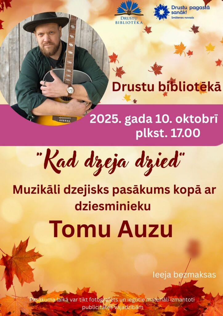 Piektdien, 10. oktobrī plkst. 17.00 Drustu bibliotēka aicina uz muzikāli dzejisku pasākumu “Kad dzeja dzied” kopā ar dziesminieku TOMU AUZU.
