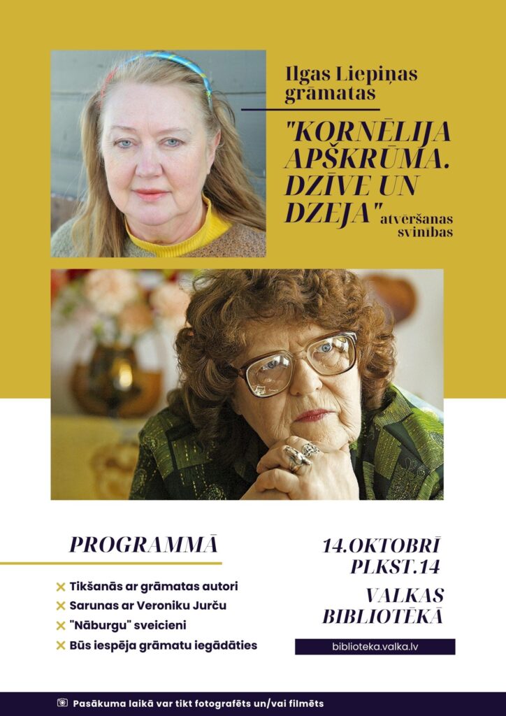 Sestdien, 14. oktobrī, plkst.14 Valkas bibliotēkā tiks atvērta literātes Ilgas Liepiņas sastādītā grāmata “Kornēlija Apškrūma. Dzīve un dzeja”. Apgāda “Jumava” izdotajā grāmatā apkopoti dzejnieces Kornēlijas Apškrūmas līdzgaitnieku atmiņu stāsti un dzīves pēdējos gados tapuši, līdz šim nepublicēti dzejoļi.