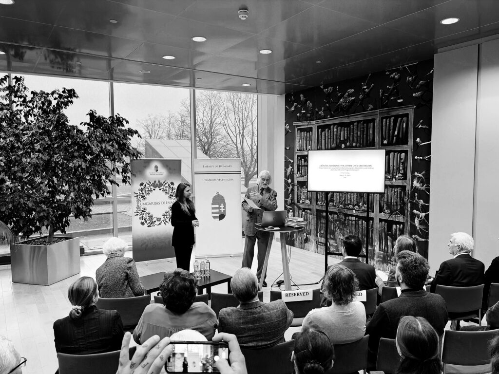 PROFESORS Jānošs Pustai stāsta Latvijas publikai par saviem tulkojumiem no latviešu uz ungāru valodu, kā arī zinātnisko darbību.
