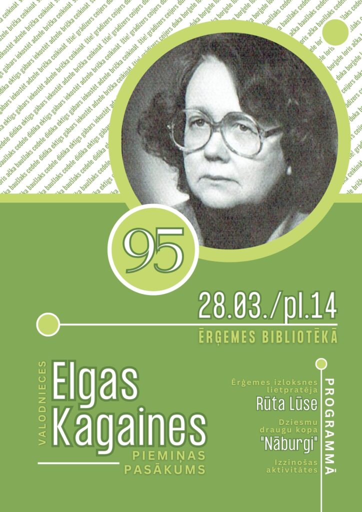 Piektdien, 28. martā, plkst.14 Ērģemes bibliotēkā par godu “Ērģemes izloksnes vārdnīcas” autores Elgas Kagaines 95. dzimšanas dienai notiks piemiņas pasākums ar dziesmu draugu kopas “Nāburgi” un Ērģemes izloksnes lietpratējas un popularizētājas Rūtas Lūses piedalīšanos.