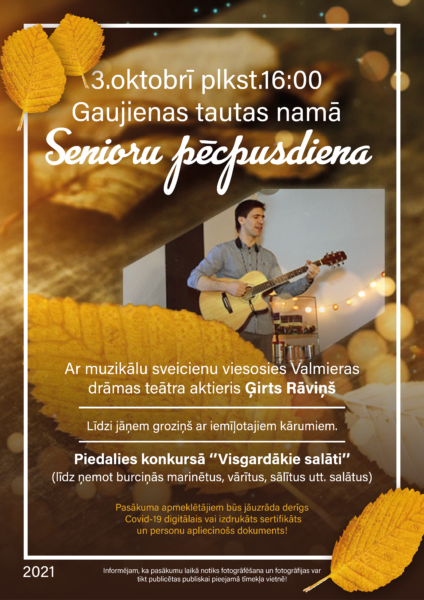 3.oktobrī  plkst.16:00  notiks Senioru pēcpusdiena Gaujienas tautas namā. Ar muzikālu sveicienu viesosies Valmieras drāmas teātra aktieris Ģirts Rāviņš.