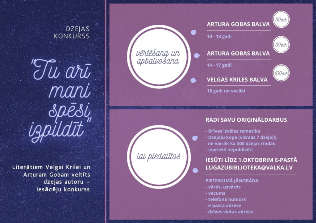 No šī gada ikgadējais Valkas novada dzejas konkurss “Tu arī mani spēsi izpildīt” veltīts diviem nozīmīgiem novada literātiem – Velgai Krilei un Arturam Gobam. Notikušas izmaiņas arī konkursa nolikumā – paplašinātas iespējamo dalībnieku vecuma grupas un papildināts naudas balvu fonds.