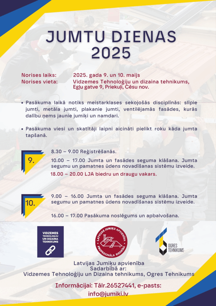 9. un 10. maijā Vidzemes dizaina un tehnoloģiju tehnikumā Priekuļos norisināsies pasākums “Jumtu dienas”, ko jau sesto gadu rīko Latvijas Jumiķu Apvienība.
