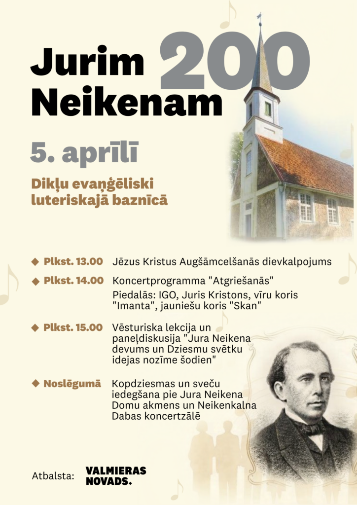 Sagaidot Dikļu mācītāja, skolotāja, rakstnieka un Dziesmu svētku tēva ievērojamo jubileju, 5. aprīlī plkst. 13.00 Dikļu evaņģēliski luteriskajā baznīcā notiks paplašinātais dievkalpojums, jo plkst. 14.00 izskanēs koncerts “Atgriešanās”, kurā muzicēs populārais un tautā iemīļotais mūziķis Igo, pianists Juris Kristons, Valmieras Kultūras centra vīru koris “Imanta” un Vidzemes Augstskolas un Valmieras Kultūras centra jauniešu koris “Skan”. Pēc koncerta plkst. 15.00 sāksies vēstures lekcija un paneļdiskusija “Jura Neikena devums un Dziesmu svētku idejas nozīme šodien”, ko vadīs muzeju speciāliste Ilona Miezīte, LELB Dikļu draudzes priekšniece un vēstures skolotāja Inita Hihalovska. Pasākuma noslēgumā – kopdziesmas un sveču iedegšana pie Jura Neikena Domu akmens un Neikenkalna Dabas koncertzālē.