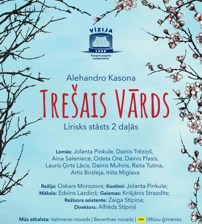 ”Trešais vārds” amatierteātra “Vīzija” interpretējumā ir smalks un juteklisks stāsts par īstām, cilvēciskām jūtām – skumjām, alkām, sāpēm, viltu, dusmām, prieku, vilšanos, un pašu galveno – to, kas sirdīm liek pukstēt straujāk, kas maina cilvēkus un pasauli. Izrādes darbība notiek Spānijas ziemeļos, Pireneju kalnu pakājē divdesmitā gadsimta sākumā.