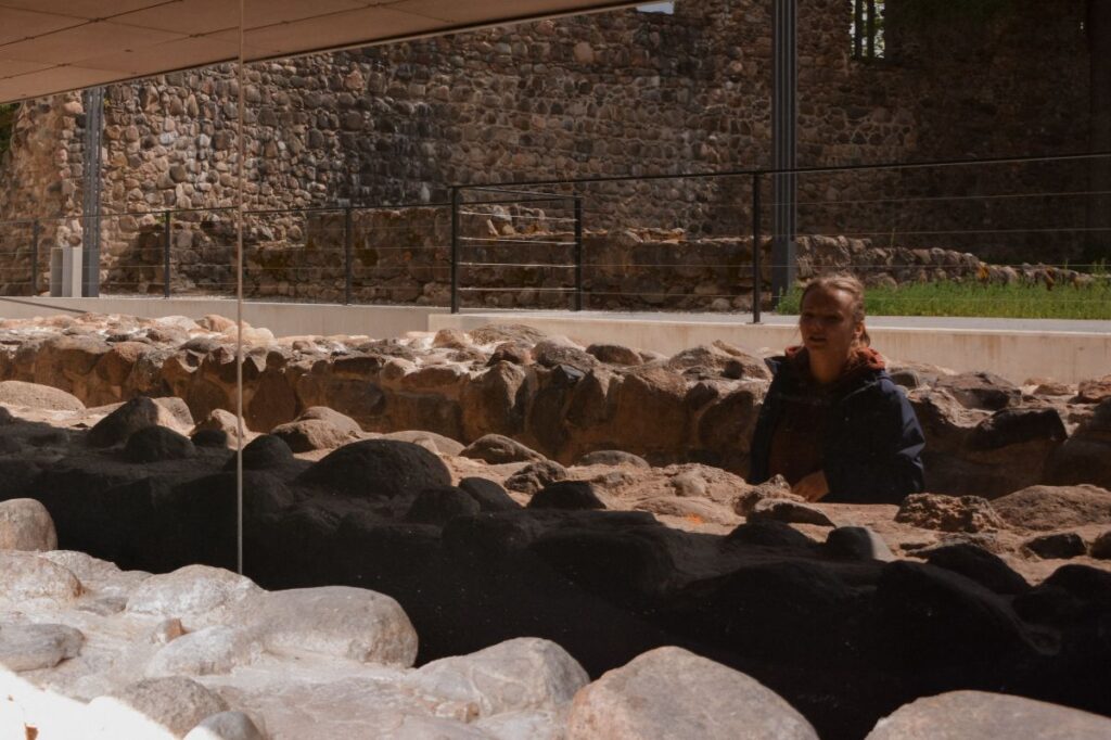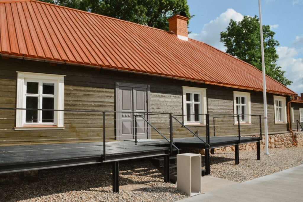 “Šeit mēs redzam zīmējumu, ko sagatavoja arhitektoniski mākslinieciskās izpētes pētnieks, būvpētnieks Ilmārs Dirveiks. Viņš konstruēja šo seno ēku, kā tā bija izskatījusies uzcelšanas laikā 18. gadsimtā. Šīs zīmējums arī ir pamatā, sagatavojot ēku ekspozīcijai, tāpēc te redzamas daudz neliela izmēra telpas. Tā agrāk konstruēja mājas siltuma saglabāšanai,” stāsta Liene. “Autentiska ēkas iekšējā veidola atjaunošana bija iespējama, jo, noņemot apšuvumu, tapetes un citu padomju laika uzslāņojumu, tikām līdz oriģinālajai guļbūves ēkai. Šāda tipa ēkai var labi redzēt iezāģējumus, kur ir stūru salaidumi, varēja saskatīt, kur sākotnēji ēkai bijušas starpsienas. Varbūt interesanti, ka manteļskurstenis jeb apvalkdūmenis nav būvēts pret ārdurvīm, kas ir atšķirīgi, salīdzinot ar citām 18. gadsimta ēkām. Turklāt varam redzēt, ka pie skursteņa laika gaitā bijušas piemūrētas krāsnis, pat dažviet gruzdējuši baļķi starpstāvu pārsegumā,” papildina Alberts.