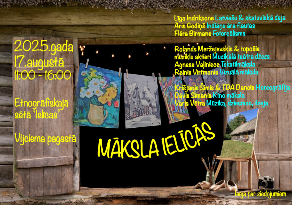 2025. gada 17. augustā etnogrāfiskā sēta “Ielīcas” Valkas novada Vijciema pagastā jau sesto gadu aicinās ikvienu – lielus un mazus, ģimenes un draugus – uz īpašu notikumu “MĀKSLA IELĪCĀS”. Šī būs diena, kas ļaus mākslu piedzīvot pavisam citādi un savādāk: mums būs iespēja redzēt, dzirdēt, sajust, satikt un pat pašiem kļūt par māksliniekiem.