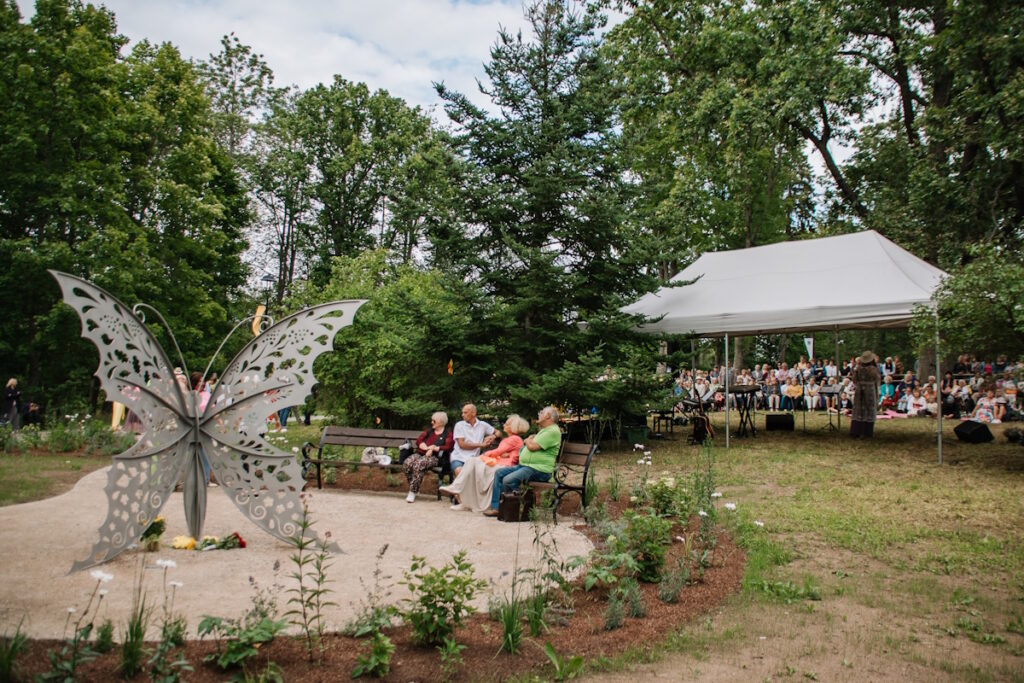 “Mēs, mūziķi, šoreiz aizgājām tikai padziedāt, tas ir vienkāršākais, taču cita lieta ir to visu  organizēt. Taču doma mums visiem bija viena – lai taptu šī skaistā vieta, kuru var apdzīvot, kur var radīt labas emocijas, vai tie būtu dzejas dienu pasākumi vai maza formāta koncerti. Ja būs idejas, tad cilvēki domās – “kur tad liksim to ideju”? Re, pie taureņa, jo taurenis – tie ir spārni, tā ir dzīvība,” teic Inga Lazdiņa, domājot no metāla veidoto taureņa skulptūru jaunajā kultūrvietā.
