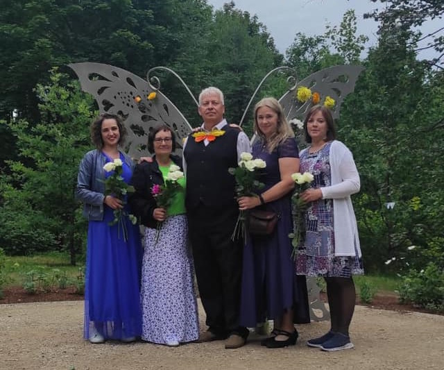 “Ir padarīts labs darbs, kas bija nepieciešams, lai apliecinātu dzejnieces piemiņu,” Marikas Svīķes dzīvesbiedrs Vilnis Svīķis (vidū) uzteic biedrības “Smiltenei un Latvijai” paveikto jaunās kultūrvietas izveidē. Attēlā: biedrības valdes locekles Lāsma Vilkasta (no labās), Līga Krūmiņa, Vinete Brunovska un biedrības pārstāve Aija Kramiņa. Foto: “Smiltenei un Latvijai”