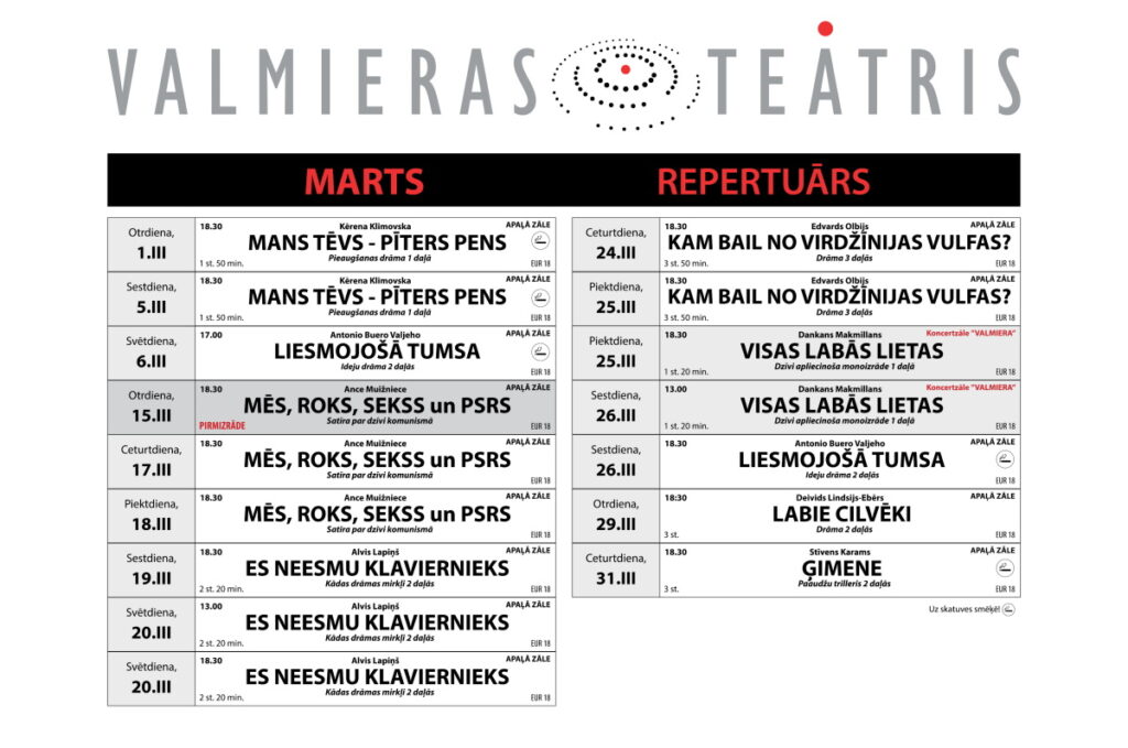 Uzsākta Valmieras teātra marta repertuāra biļešu tirdzniecība. 15. martā pirmizrādi piedzīvos dramaturģes Ances Muižnieces, režisora Jāņa Znotiņa, scenogrāfes Pamelas Butānes kopdarbs iestudējumā jauniešiem “Mēs, roks, sekss un PSRS”, kas stāsta par jauniem cilvēkiem, kuri 1985. gadā piedzīvoja leģendāro grupas “Pērkons” koncertu Ogres estrādē un tam sekojošo vilciena izdemolēšanu.
