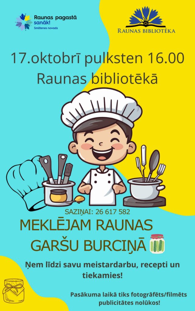 17. oktobrī pulksten 16.00 Raunas bibliotēkā norisināsies pasākums “Meklējam Raunas garšu burciņā”, kura laikā tā apmeklētāji meklēs garšu, kas piestāv mazam skaistam ciematam Vidzemē.