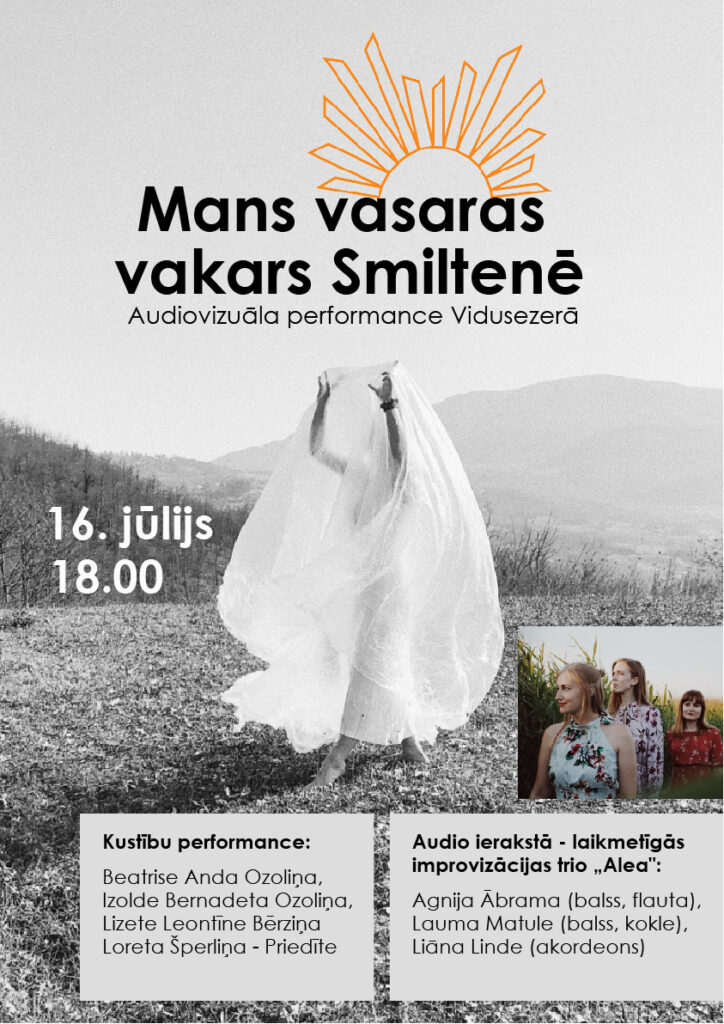 Vecā parka brīvdabas estrādē pulksten 18.00 aicinām aicinām uz audiovizuālu performanci “Mans vasaras vakars Smiltenē”. Pie Vidusezera skanēs Smiltenes iedzīvotāju stāsti par vasaras vakaru atmiņām – iepazīšanos, mīlestību un jaunu draudzību sākumu. Audio ierakstā būs dzirdama arī laikmetīgās improvizācijas trio “Alea” oriģinālmūzika – Agnija Ābrama (balss, flauta), Lauma Matule (balss, tradicionālā kokle) un Liāna Linde (akordeons). Ansambļa nosaukums “Alea” (spēle – no latīņu valodas) simbolizē laikmetīgās improvizācijas būtību. Tas ir kaut kas neparedzams, spēle ar iespējām un nejaušībām. Katrs priekšnesums ir absolūti īpašs un neatkārtojams, jo tiek radīts tieši te un tagad, iedvesmojoties no laika, telpas, publikas, kā arī ļaujoties emocijām. Stāstus un mūziku papildinās kustību perfomance: Beatrise Anda Ozoliņa, Izolde Bernadeta Ozoliņa, Lizete Leontīne Bērziņa un Loreta Šperliņa-Priedīte.