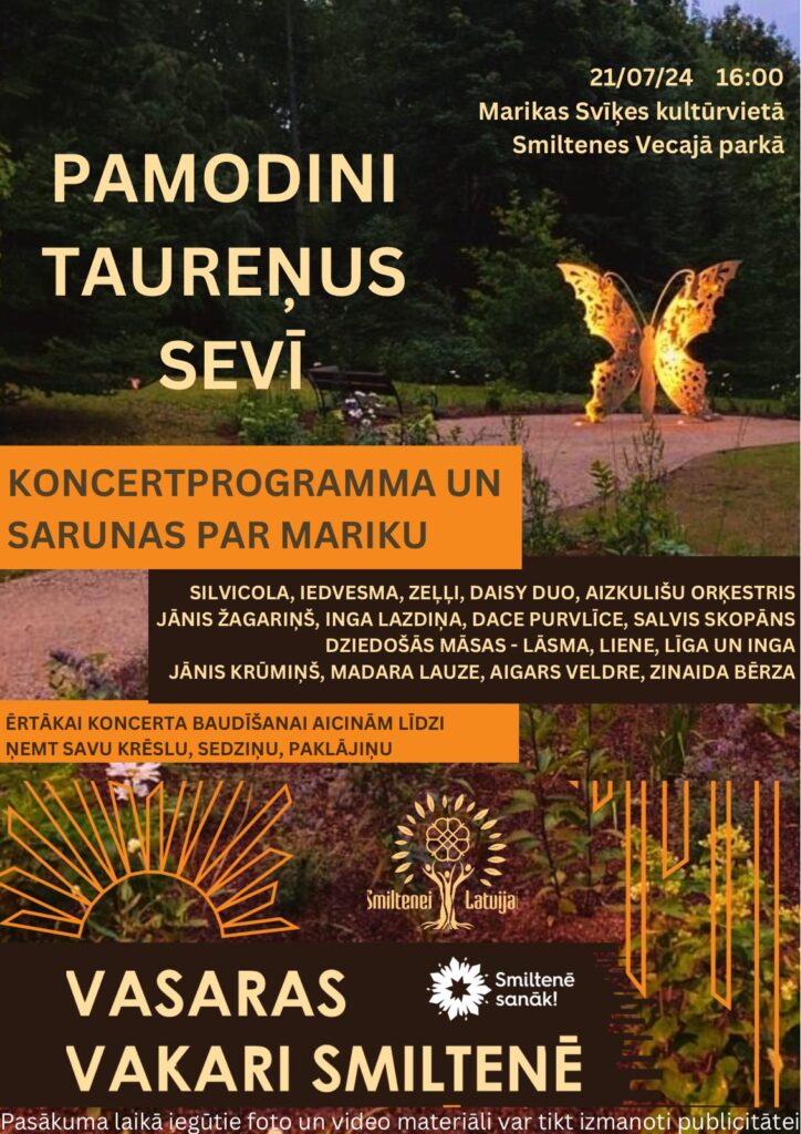 Pulksten 16.00 Vecajā parkā, dzejnieces Marikas Svīķes kultūrvietā, piemiņas pasākums – koncertprogramma “Pamodini taureņus sevī”. Marikai Svīķei veltītajā pasākumā koncertēs Latvijas meža darbinieku vīru koris “Silvicola”, sieviešu vokālais ansamblis “Iedvesma”, grupa “Zeļļi”, akustiskais duets “Daisy Duo”, “Aizkulišu orķestris”, Jānis Žagariņš, Inga Lazdiņa, Dace Purvlīce, Salvis Skopāns, Jānis Krūmiņš, Madara Lauze, Aigars Veldre, Zinaida Bērza un dziedošās māsas – Lāsma, Liene, Līga un Inga. Ērtākai koncerta baudīšanai aicinām līdzi ņemt savu krēslu, sedziņu vai paklājiņu.