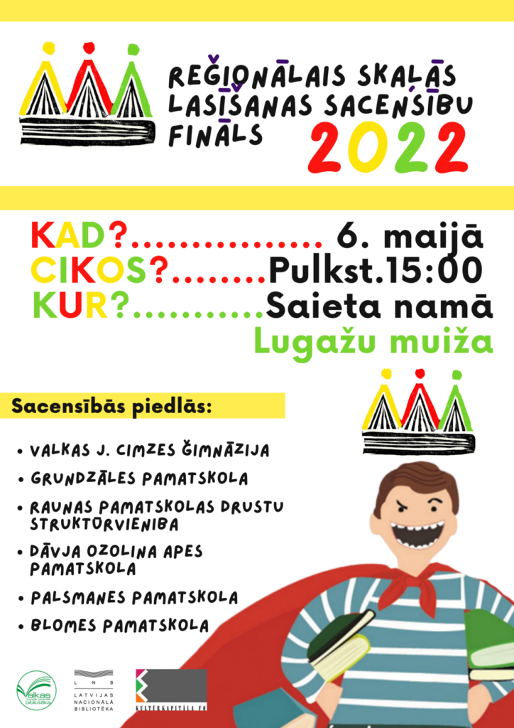 Piektdien, 6.maijā, Valkas pagasta Saieta namā “Lugažu muiža” notiks “Nacionālās Skaļās lasīšanas sacensību” 2. kārta. Tajā par vietu finālā un lasīšanas čempiona titulu sacentīsies 8 Valkas un Smiltenes novada skolu 5.klašu skolēni.