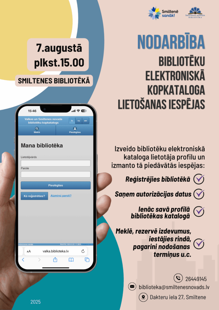 Ceturtdien, 7. augustā plkst. 15.00 Smiltenes bibliotēka aicina interesentus uz nodarbību “Bibliotēku elektroniskā kopkataloga lietošanas iespējas”. Nodarbības laikā uzzināsiet, kas ir bibliotēku kopkatalogs, kā to atrast, un kā izmantot tā priekšrocības, saņemot bibliotēkā attālinātā lietotāja vārdu un paroli.