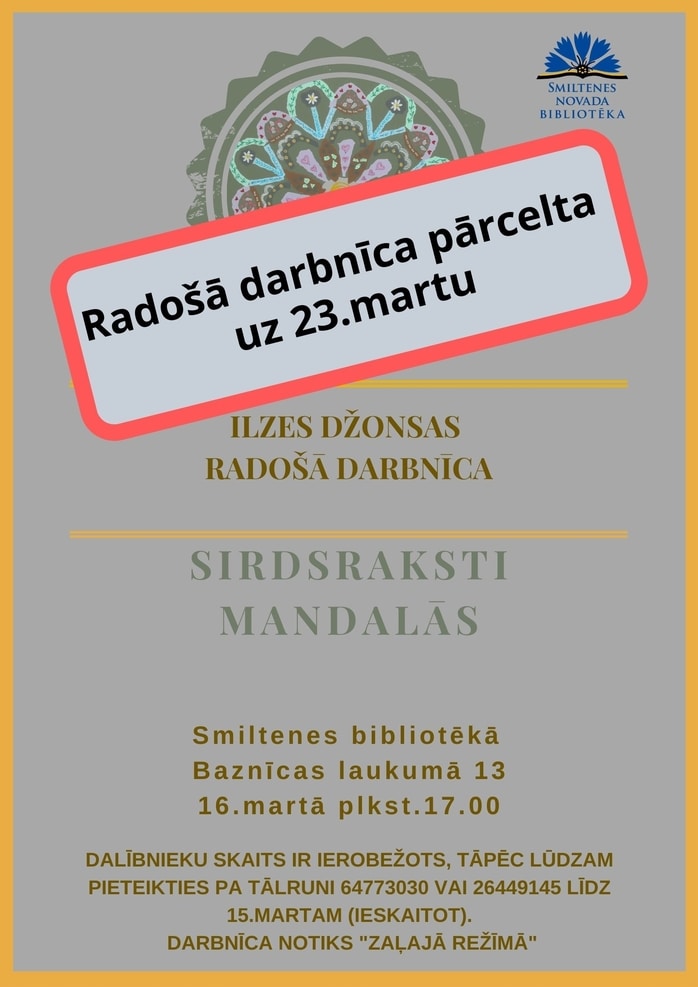 Smiltenes bibliotēkā 16.martā plānotā Ilzes Džonsas radošā darbnīca “Sirdsraksti mandalās”pārcelta uz 23.martu plkst.17.00. Uz radošo darbnīcu joprojām ir iespējams pieteikties, ir brīvas vietas.
